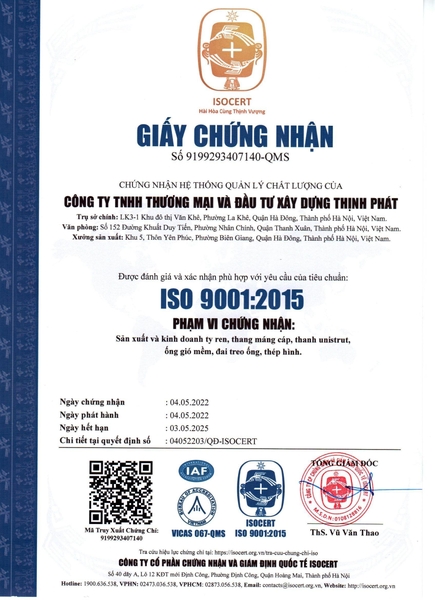 Thanh ren chịu lực, ty ren chịu lực công ty Thịnh Phát được Trung tâm kỹ thuật tiêu chuẩn đo lường chất lượng 1 thuộc Tổng cục tiêu chuẩn đo lường chất lượng kiểm định dựa trên phương pháp thử ISO 898-1:2013 với 1 số loại thanh ren có cấp bền 4.8 và 5.6 như sau: